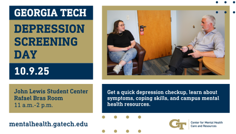 The Center for Mental Health Care and Resources is observing National Depression Awareness Month this October by having a Depression Screening Day on Oct. 9. Students who are interested in getting a free screening can come to the Rafael Bras Meeting Room on the third floor of the John Lewis Student Center from 11 a.m.-2 p.m. Speak with a mental health professional about symptoms, coping skills, and campus mental health resources while getting a quick checkup. Learn more about the Center for Mental Health Care and Resources or make an appointment by calling 404.894.2575 or walking into Suite 238 in the Smithgall Student Services Building during business hours.