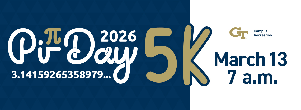 Lace up for Campus Recreation’s annual Pi Day 5K on Friday, March 13 and take on the Pi Mile loop around campus! Georgia Tech Students, faculty, staff, and alumni members are welcome to participate in this event. Race day is limited to 350 participants.Cost: $25 for GT students; $35 for non-studentsT-shirts: Participants who complete the 5k race can pick up their event T-shirt upon completion of the race.Check-in: Begins at 6:00 a.m. at Campus Recreation.Race Start: 7:00 a.m. in front of Campus Recreation on Ferst DriveCourse Details: The race will follow the Pi Mile course on campus (slightly altered due to construction). This year the course will have official race course chip timing.Register now at crc.gatech.edu/piday-5k/